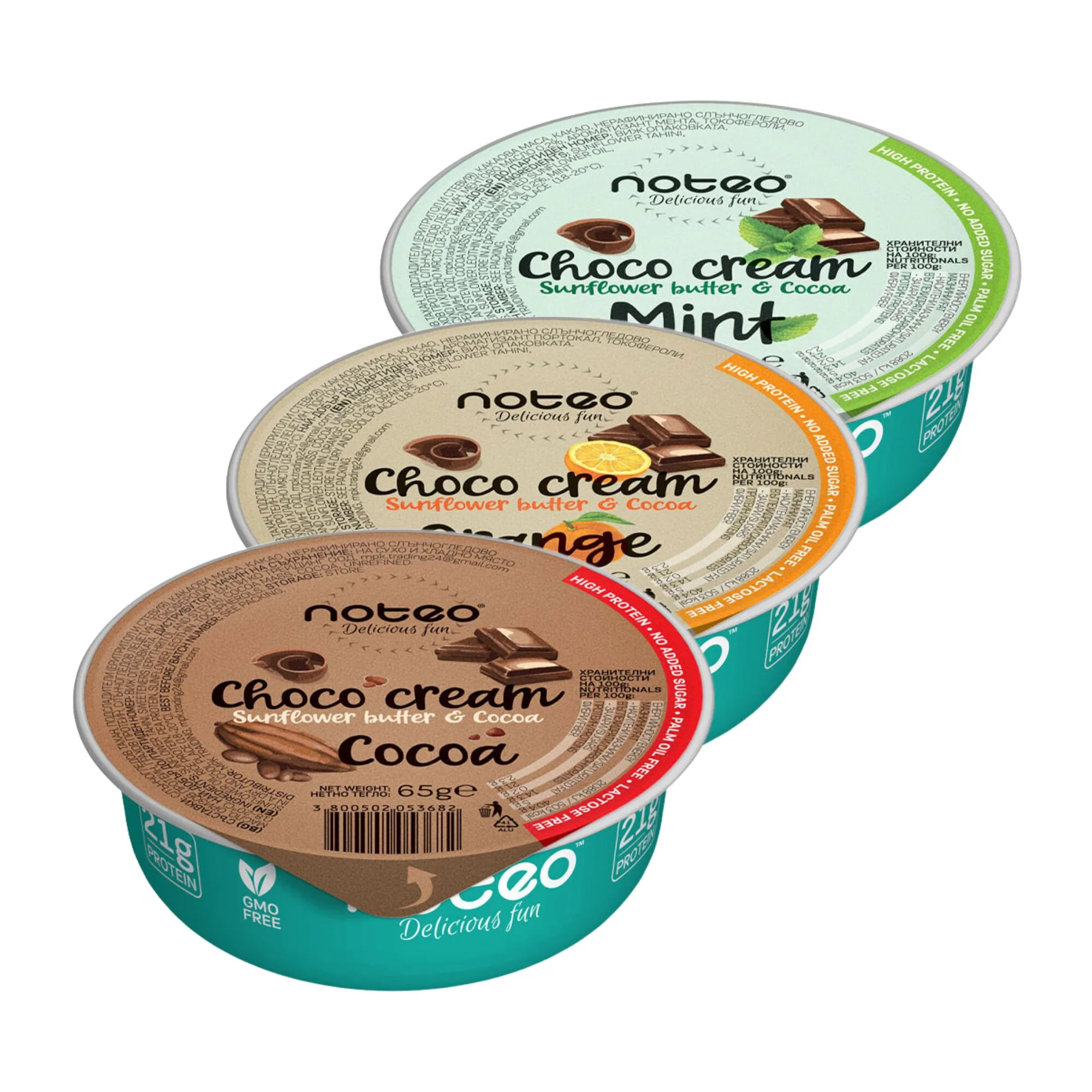 Протеиновият шоко крем NOTEO МИКС е 100% веган продукт, приготвен от слънчогледово семе — достъпен в три вкуса наведнъж: какао, портокал и мента. Идеален за тези, които искат да опитат всички аромати или да разнообразят ежедневната си закуска. Съдържа над 20 г растителен протеин на 100 г — без добавена захар, без глутен и без ГМО.